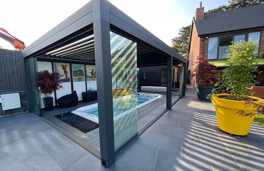 Pergola with Sliding Doors: Imagine a pergola adorned with sleek sliding doors that effortlessly glide open to reveal your inviting swim spa sanctuary. These doors not only provide protection from the elements but also offer the flexibility to seamlessly integrate indoor and outdoor spaces. Whether you’re hosting a gathering or simply seeking solitude, sliding doors allow you to tailor your swim spa experience to your mood and preferences. With the added benefit of unobstructed views and natural light, a pergola with sliding doors creates an open and inviting atmosphere that beckons you to relax and unwind.