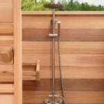 The Cloudburst Outdoor Shower features a modern privacy wall design with a self closing door mounted with stainless steel hinges. Enjoy this free standing outdoor shower at your cottage or in your backyard to cool down after a sauna session, swim in the lake or pool or to rinse down after relaxing in your hot tub. Handcrafted with western red cedar and shipped in an easy to assemble kit the Cloudburst Outdoor Shower is a popular design.