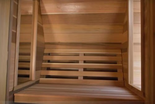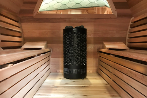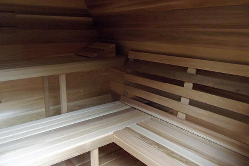 Premium Sauna Bench upgrade includes curved benches, back rests and flat floor. Available for electric and woodburning heater.