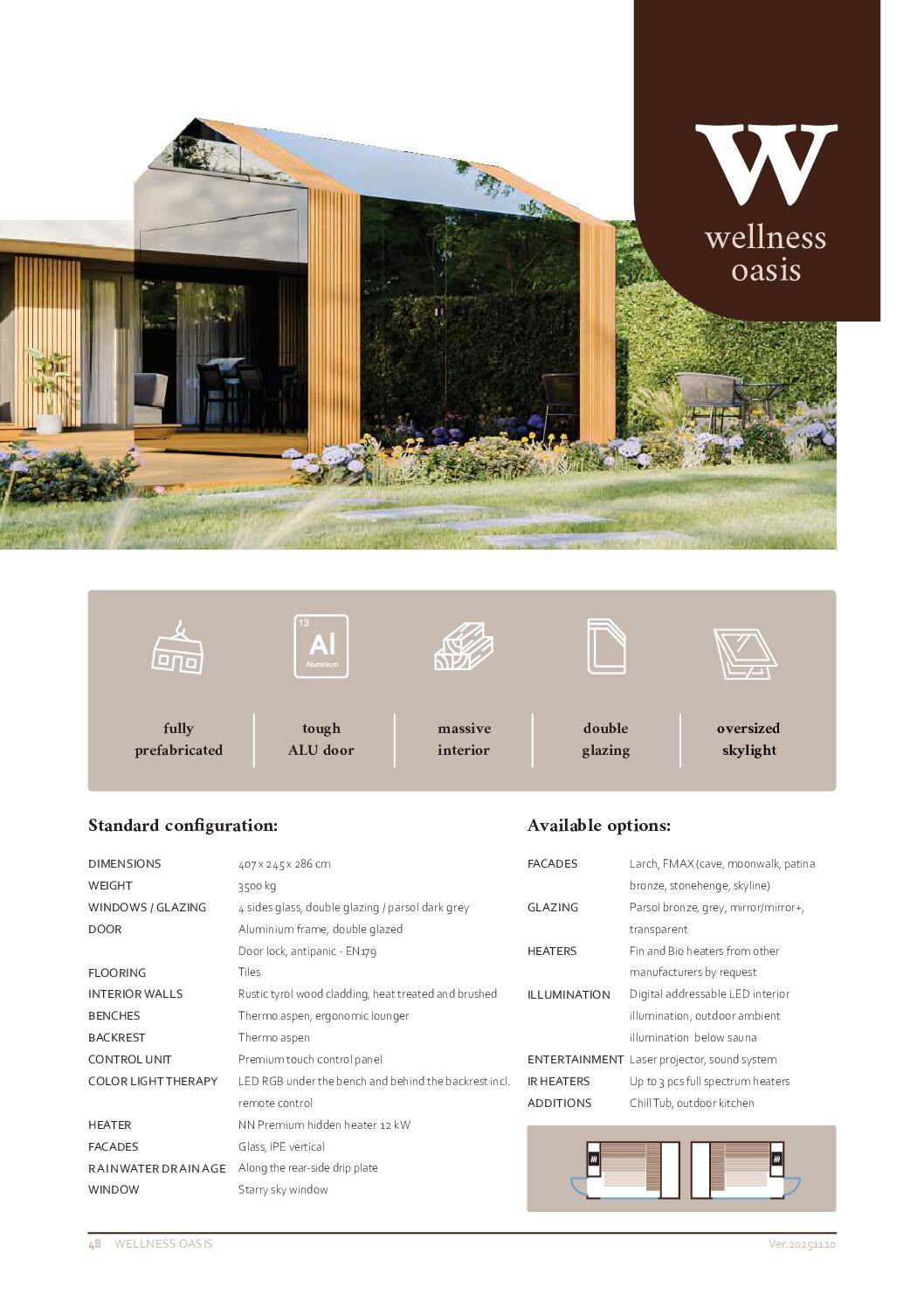 The asymmetrical gable roof is not only for an intriguing side profile, it also has a functional aspect distributing the heat towards the user and giving the possibility for a very large skylight. With the use of special dark grey glass, the user is able to see outside from inside but not vice versa, which gives an even more relaxed feeling. For a quick break and numerous health benefits, there is an ice bath addition with an automatically and smoothly opening door.