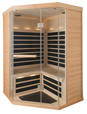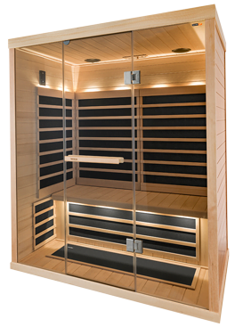 You can choose to take a traditional sauna bath, or enjoy the beneficial warmth of infrared panels, or use both at the same time. The heat source is covered by wood backrests and fabric with the panels installed vertically. In new saunas, the heaters are installed straight into the walls but infrared heaters can be retrofitted as well.